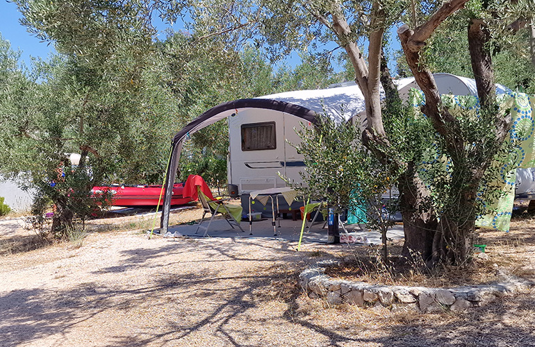 Kamp je ukupne širine 50m na najširem dijelu i ukupne dužine 200m. Specifičan klinasti oblik kampa osigurava blizinu mora, struje i sanitarija svim parcelama podjednako.